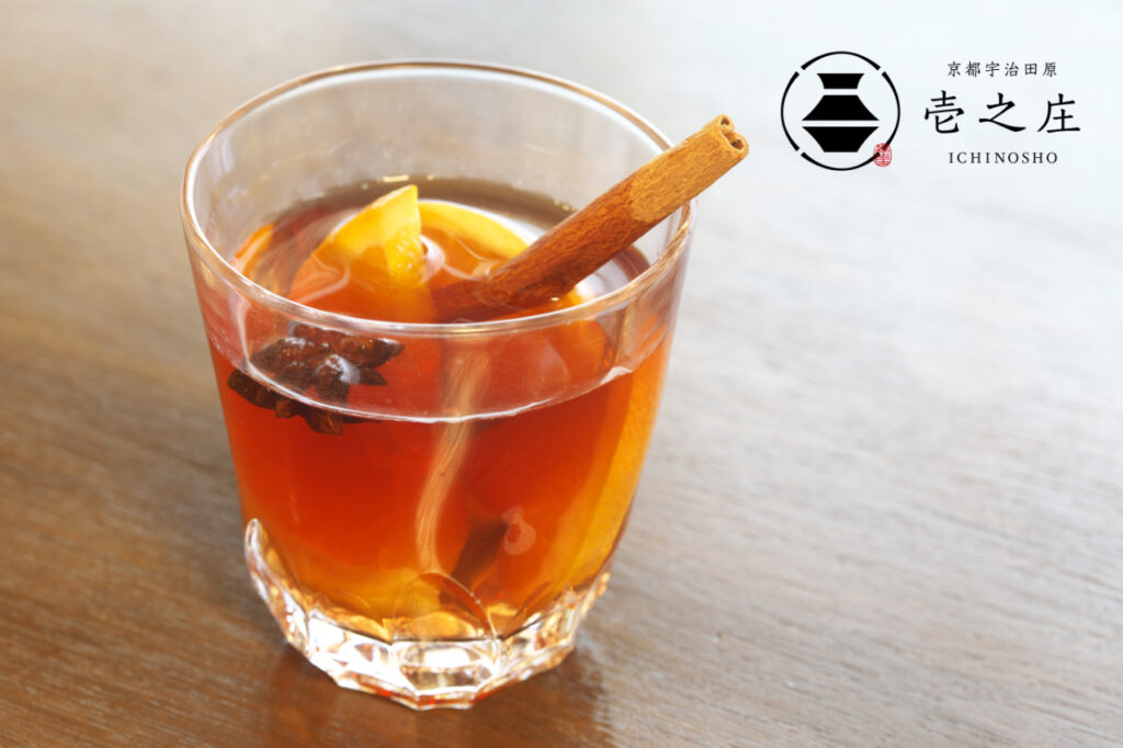 1. 熱湯で淹れた「雁ヶ音ほうじ茶 壱之棒」をグラスに注ぐ。