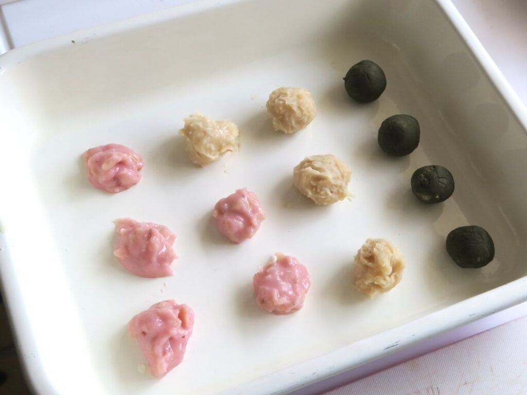 2. 三等分し、ひとつにはほうじ茶パウダーを、もう一つには梅干しの漬け汁(または包丁で叩いた梅干し)を加える。残る一つはそのままで。それぞれ小さく丸めておく。