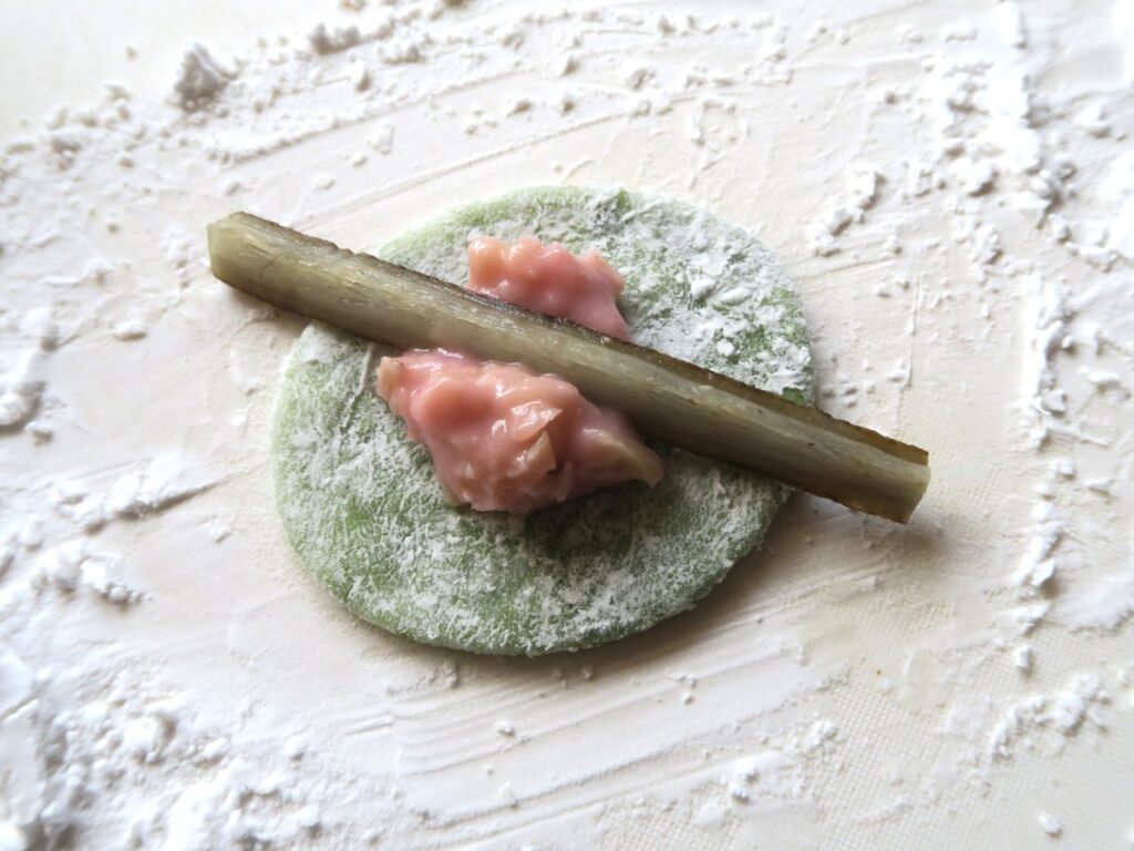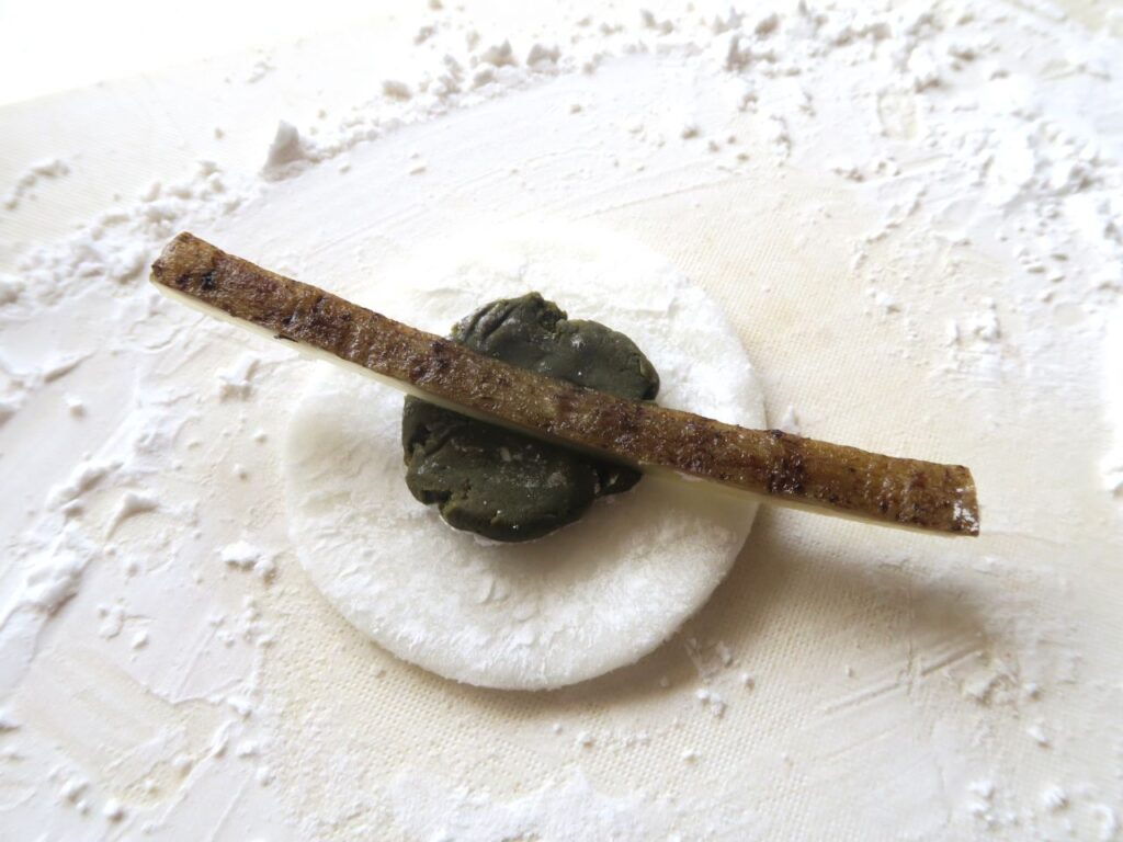1. お餅の中央にあんこをのせ、ごぼうの甘露煮(芯)を置き、お餅を折りたたむ。